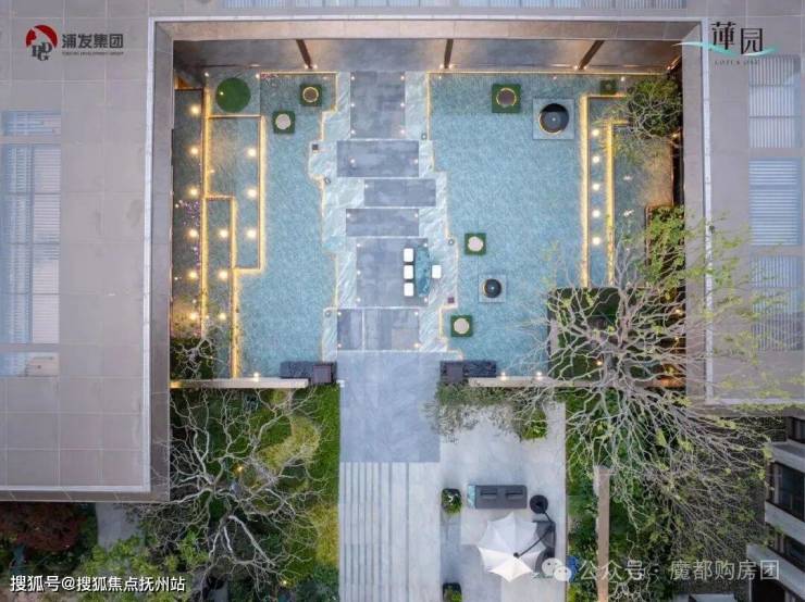 中央水韵庭院以「叠水莲池」为理念打造多层次的水景体系,叠水瀑布形成动态的水流韵律,池畔大理石打造的休憩长桌,成为被绿意环抱的林下空间,氛围相当惬意~