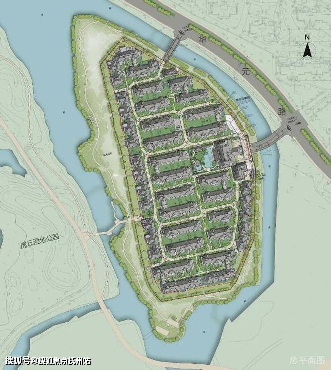 小区出入口设在华元路,靠两座桥连接社区,西边还有专属人行步道直通虎丘湿地公园,真正实现“一步进公园”。