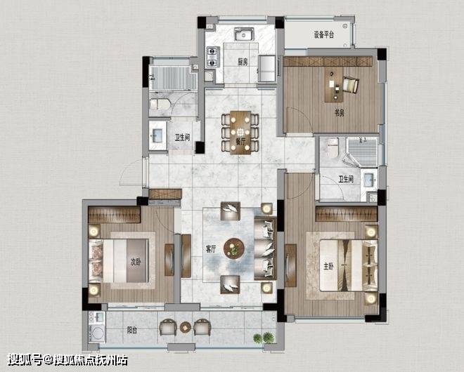 如果担心日光烧灼,更喜室内赏景,还有建面约120㎡的三房户型可以选择。