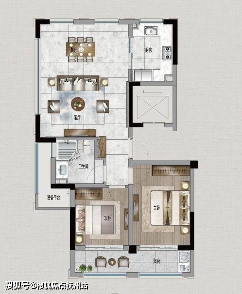 以建面约90㎡边套为例,双卧设计,将大量的空间给予LDK区,超大竖厅,大面框飘窗,还赠送一个大露台。