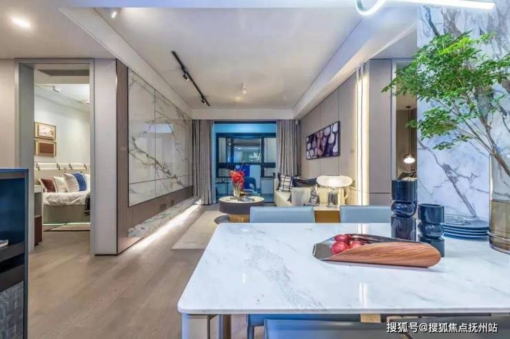 厨房+餐厅+客厅+大面积观景阳台一体化,公区连成一线,尺度感和空间感更胜一筹。