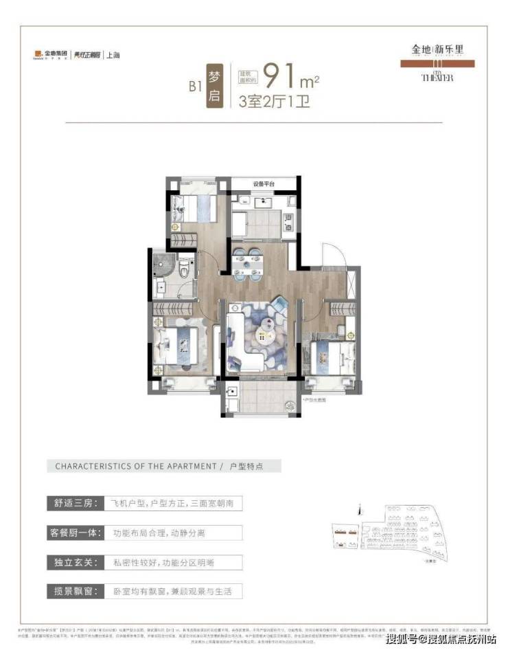 建面约91㎡的3房户型实现了三开间朝南的格局;