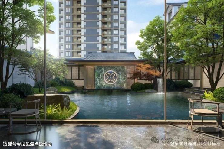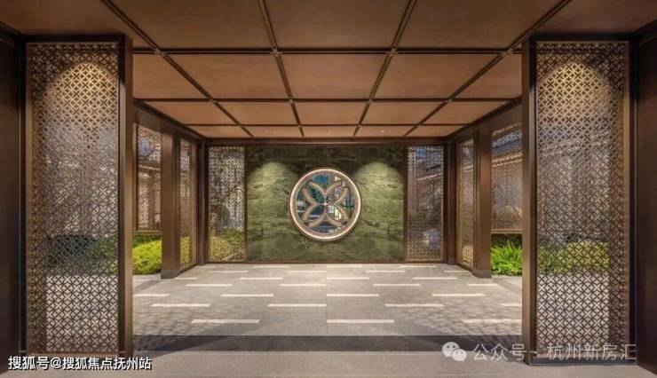 采用“王府中式”设计,大门为歇山顶形制(宽53米、高近11米),配黄铜狮、罗汉松及蓝翡翠奢石。园林融入西湖十景元素,如“花港观鱼”水景、“柳浪闻莺”绿植,并设雾森系统首层单元门厅石材铺就,肌理沉稳。