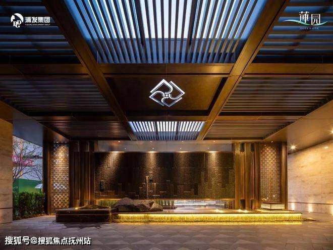 社区门庭圣罗兰奢石、白雪公主透光玉石、玉曼米黄大理石,搭配深咖色定制纹样金属打造,气势磅礴!门庭内「水韵莲径」架空走廊以石材景墙与金属格栅构成曲径通幽的通道,极具东方韵味~