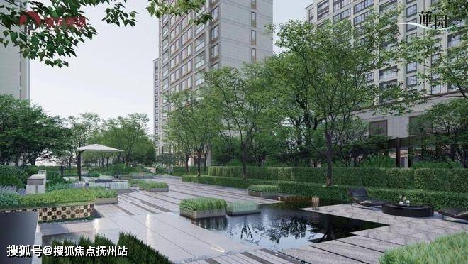 中央水韵庭院以「叠水莲池」为理念打造多层次的水景体系,叠水瀑布形成动态的水流韵律,池畔大理石打造的休憩长桌,成为被绿意环抱的林下空间,氛围相当惬意~