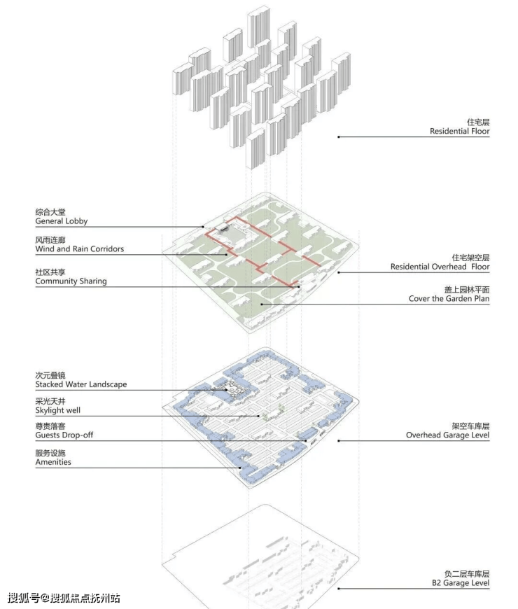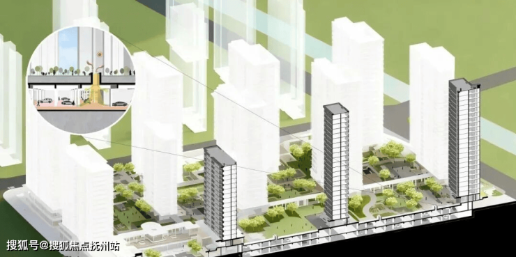 为彻底消融城市与社区的界限,项目以“超级底盘”重构社区基座。通过抬高地库、整合车站与商业配套,将地下空间转化为多功能垂直枢纽。