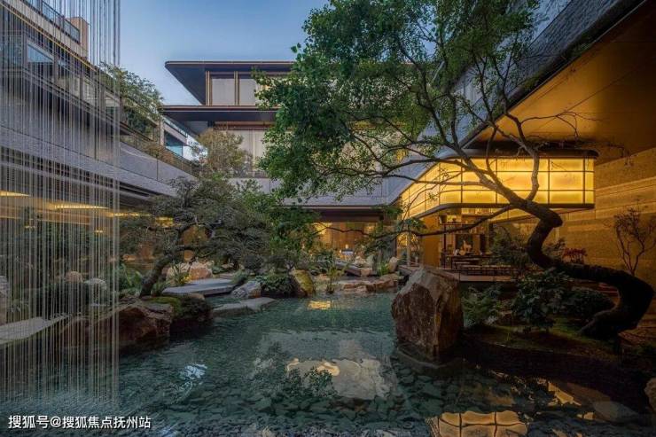 景观设计同样令人惊艳,蓝颂设计宋淑华以金华山水文脉为创作源泉,特别选用了本地双龙洞石材,通过叠水、镜池、桥舟等场景的巧妙营造,再现了金华独有的自然意境。