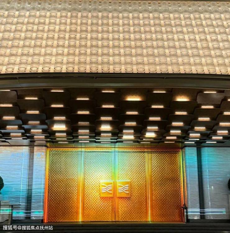 你看社区大门宽约46米,高约9米,灵感源自“京杭大运河博物馆”设计,顶部大约2280块水晶瓦精心雕琢,内部超300块金鳞铝板手工拼接,还有层叠水景,整个一看就贵气。