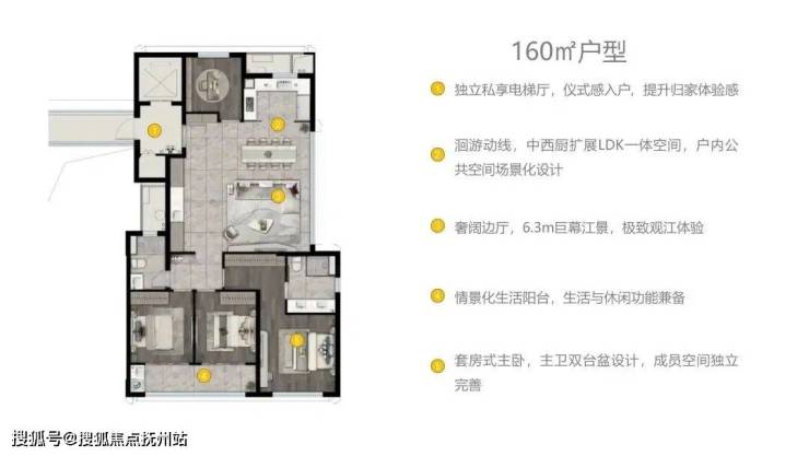 本项⽬楼王产品为198平⽶全景观江的端厅⼾型,通过南向阳台、东向飘窗的组合,使客餐厅区域获得了270°的全景观江视野。超大的玻璃窗分格设计,旨在使奉化江的美丽江景能尽收眼底。