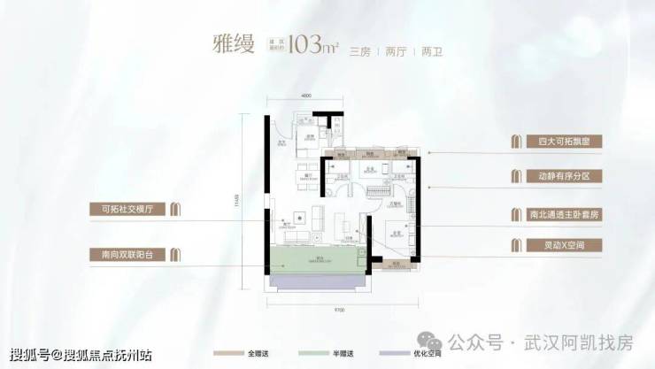 中间户建面103㎡,通过花池+飘窗的赠送,整体赠送面积18.87平,得房率超过90%,和客厅联通的X空间,可以做书房、茶室等空间,他的空间观感甚至可以比你看传统超高层120平要更大