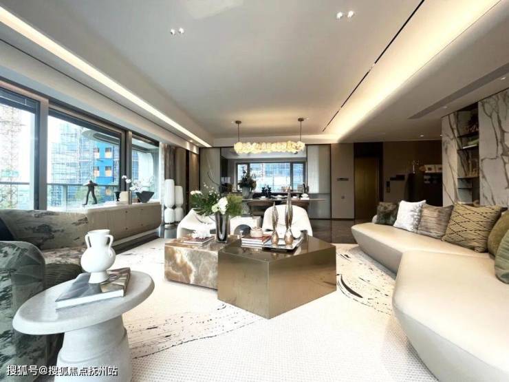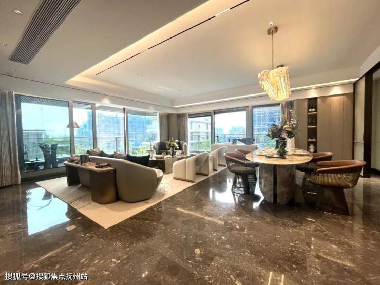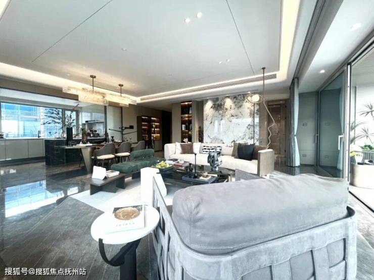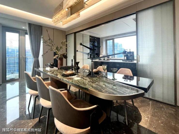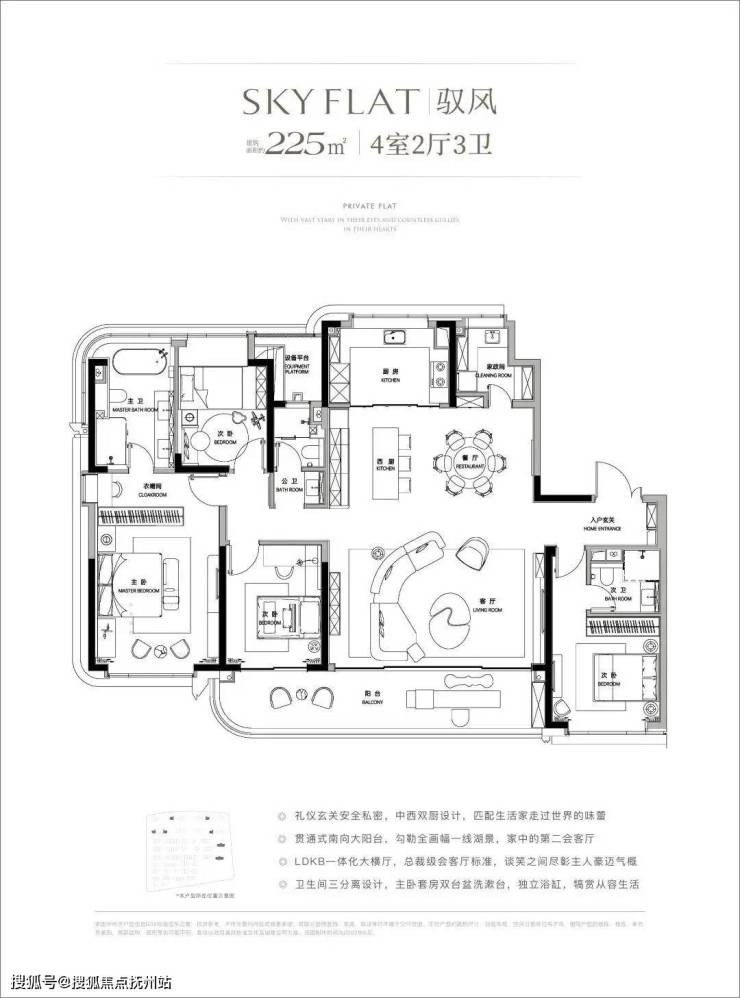 建面约225㎡户型:静分区非常明显,超大的一体化客餐厅设计。中西双厨设计,满足业主与国际接轨的生活需求。值得一提的是,LDKB一体化餐厅设计,连通环幕观湖阳台,可容纳9~12人在家开聚餐。结合宽景观面,空间视野在无锡几乎难寻出其右者。