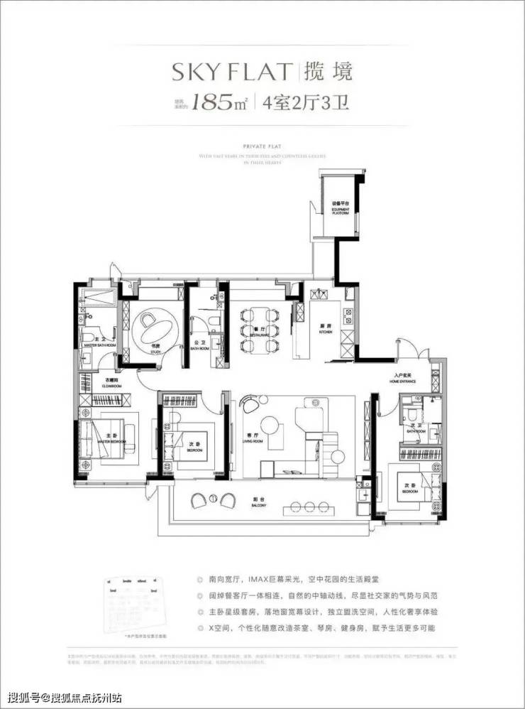高层建面约185㎡户型:4房2厅3卫,尺度更进一步,IMAX巨幕采光视野,客厅延展出去集会客休闲于一体。另外,该户型还为双套房设计,所有主卧、次卧均有独立卫浴。超大景观阳台连通客厅与卧室,使得无论哪个空间都能欣赏窗外的风景。