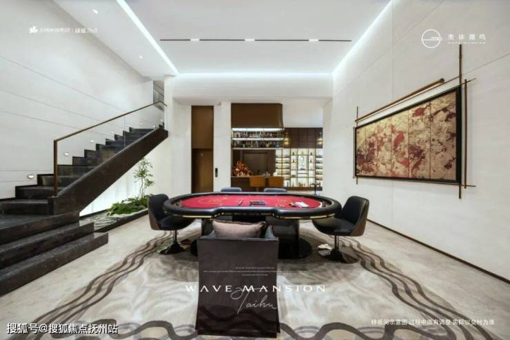 高层主题架空层,地面精选深色仿古地砖,墙面采用浅色墙面砖,缀以金色隔断屏风,整体视觉上传达了一种雅奢的腔调。除了文创区,G1架空层内还打造社区会客空间和红叶空间。既可供来访会客,邻里交流,也可变身观景的小憩之处。