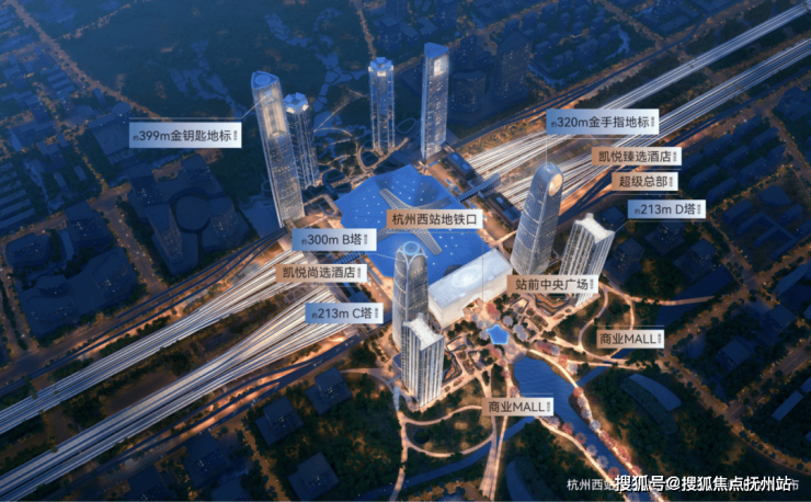 包括未来杭州的第一高——约399m的“金钥匙(在建)、第二高——约320m的“金手指(在建),以及高约200m的天街综合体(在建)、高约180m的双子塔浙大校友企业总部经济园(在建)、高约185m双子塔浙江人才大厦(在建)、高约100m的杭州资本云城科创中心等
