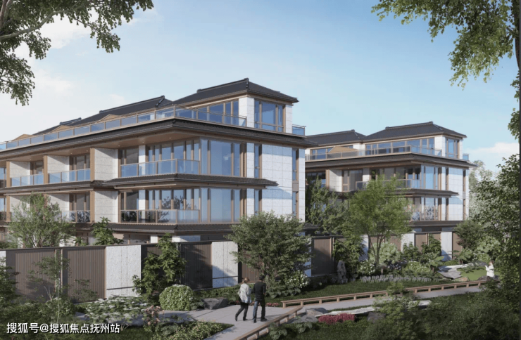 三重屋檐,代表天地人融合的东方宫殿最高等级,上檐、外檐、下檐三重结构,现代立面,以铝板、格栅、石材、瓦墙型材、玻璃等现代型材,彰显传世之宅的独特气度。