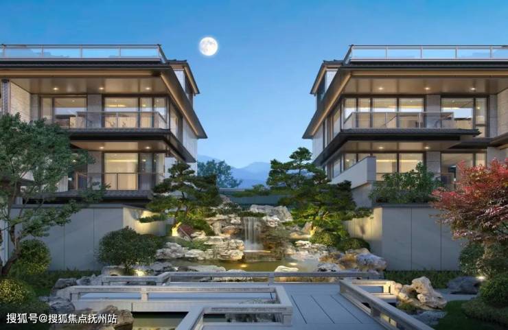 久映颂月府的投入远不止这些奢石、古树,从排屋建筑外立面也能看出一些隐形成本,伊朗进口的蓝眼睛石材,大面积落地玻璃,香槟色铝板,就连北向立面也是如此。