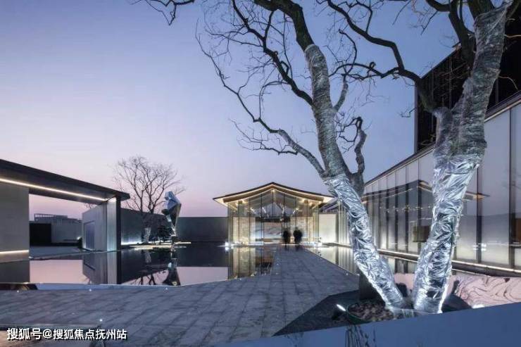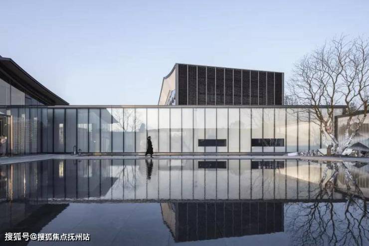 穿过大型玻璃构筑,走进前场。门楼前开阔的广场,昭示了元垄·华著“现代化、城市化”高端楼盘的定位。穿过西周直江上的景桥,即可看见景观水帘,水流淅淅沥沥地流淌,灵动悦耳,与简约的门楼相互映衬。踏上台阶,超大水面映入眼帘,水中倒映着简约现代、充满绍兴特色的销售中心建筑。