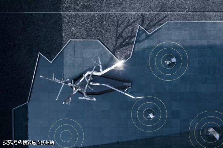 镜面水景倒映着建筑的倩影,水面与建筑融为一体。人们踱步经过,从水景侧边的镜面不锈钢中,不断看见自己的身影,趣味十足。黑色的池底,仿若一方墨池,呼应绍兴后马八景之一的“趣园墨池”。景观雕塑仿照绍兴柯岩云骨之形,静于水面,正气凛然。