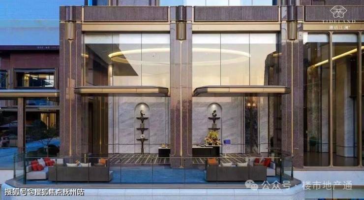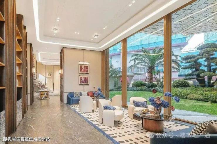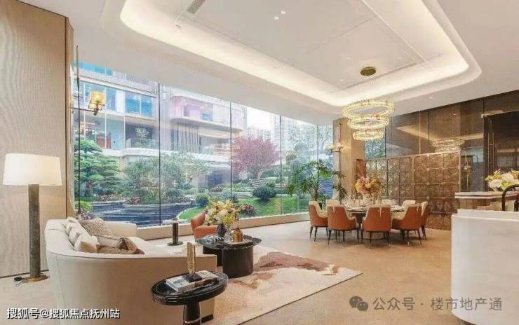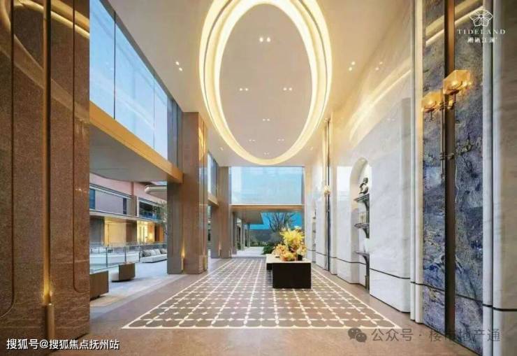再往里走是归家大堂,水景吊灯非常亮眼,落地玻璃可以直面下沉式庭院