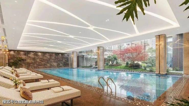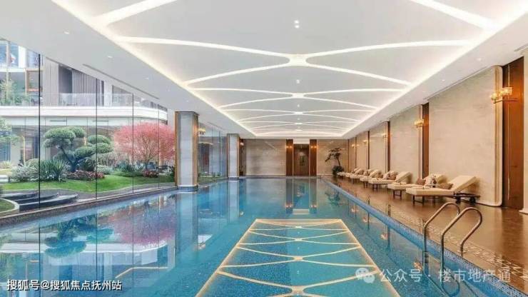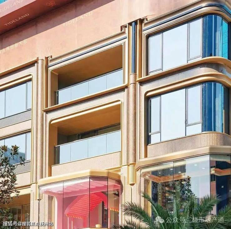 4)外立面:底部石材+四面铝板+圆弧玻璃,有小部分涂料;南面香槟金铝板+部分陶板,全域风雨连廊,还有滨江标志性蓝宝石泳池