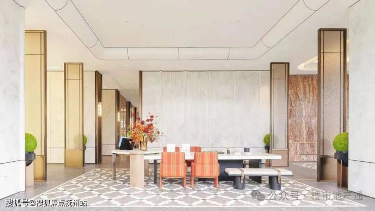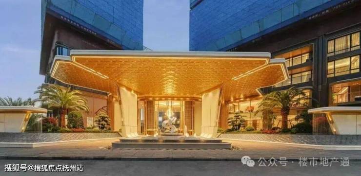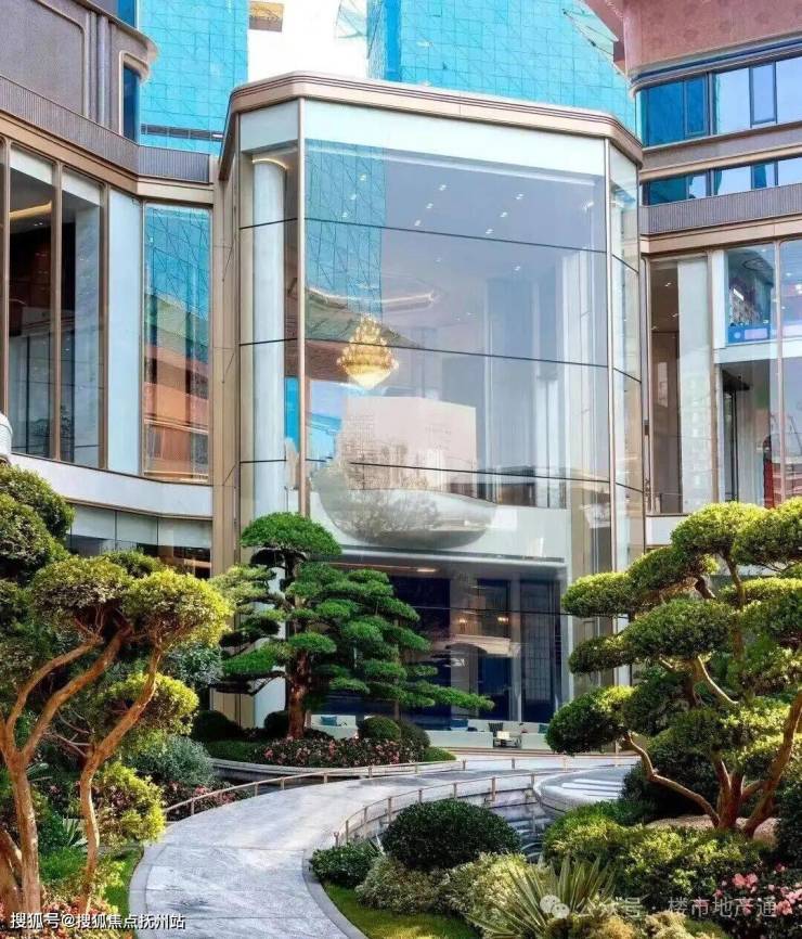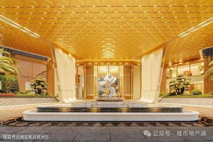 1)入户大门:门头高度9米,顶部金色花瓣做了钻石的切角,滨江传统土豪香槟金,入户雕塑+水景搭配,两侧是加纳利海藻树+迎客松,确实做的还不错,就是有点太标准的滨江风格了