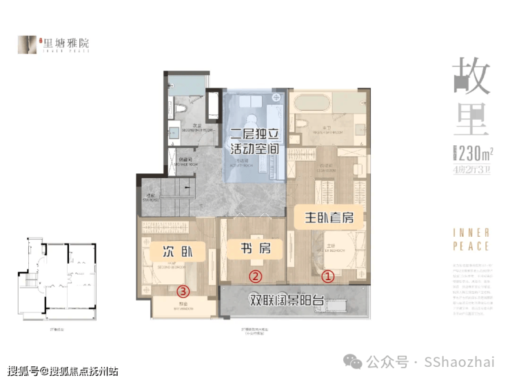 下叠230㎡,无地下室有院子(约50/300㎡)