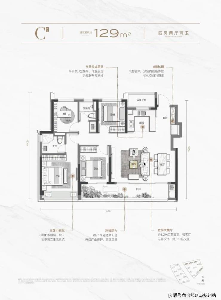 119㎡“生长型空间”同样吸睛,四房两厅两卫,且做到了四开间朝南,这在同面积段中,十分少有。主卧套房设计,有效提升了居住的私密性。LDKB设计+岛台厨房,5.6米双联阳台,俯瞰水岸盎然,重新定义了该面积段的改善可能。
