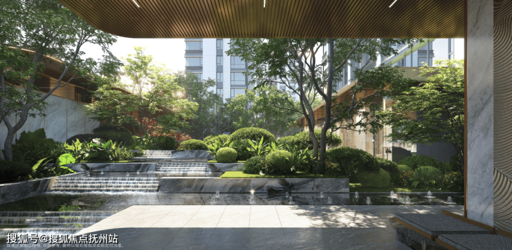依循自然肌理,创新打造约2.3万方园林景观。植入步行幽径、潺潺流水、葱郁植被等自然元素,让公园溪谷大境于社区内美好生长。