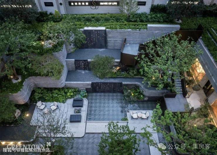“层林叠院”解构弗兰克·劳埃德·赖特“流水别墅”精髓,三阶跌水倾泻而下。台地花园有序排布,红枫、斜飘紫薇等绿植营造四季景致。阶梯步道、休憩空间巧妙设置,景随人移,随自然渐入沉浸。
