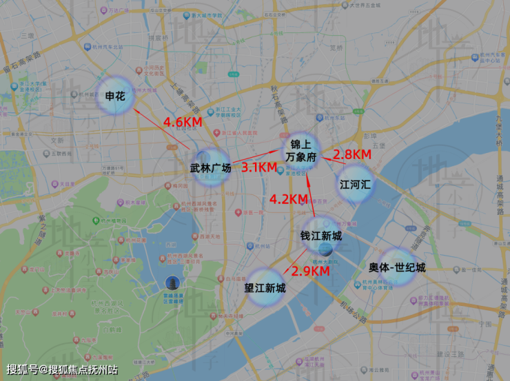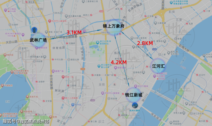 直线距离武林广场3公里出头,距离钱江新城也才4公里多点,距离江河汇竟然才3公里都不到。杭州最牛的几个中心,都以锦上万象府所在的板块为中心围绕,你说这个天然的地理位置牛不牛?