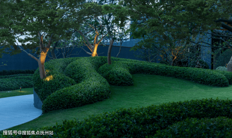 叶子造型的中央雕塑旁设呼吸灯,台阶处地埋灯,廊架顶部结合长城板布置线性灯,点景乔木下方设置射树灯,当夜幕降临,灯光变成了点睛之笔,设计师坦言:“真正的顶奢,是连灯光角度都要控制的偏执。”