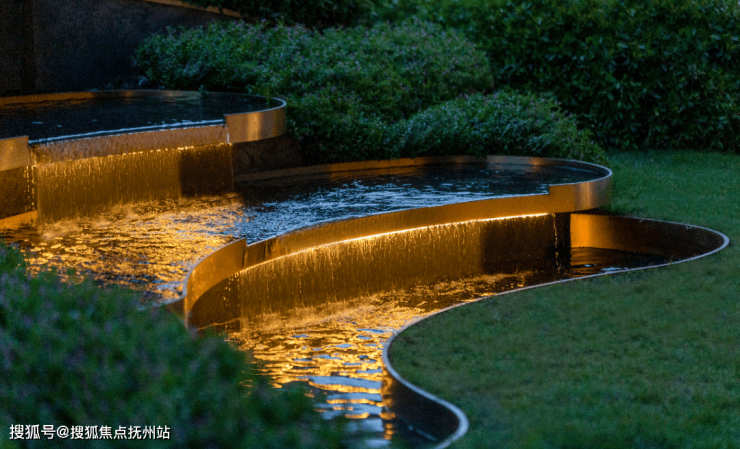 瑞府的双曲面飞瀑,是工艺与历史的双重盛宴。身怀艺技的工匠们耗时120天,手工凿刻约6米高珍珠黑大理石墙面,曲面误差达毫米级;1088块铜片以商船铆钉为原型镶嵌,水流冲刷下泛起青铜光泽,隐喻温州“海上丝绸之路”的辉煌过往。朝起暮沉,呼吸灯随水雾升腾,星河流转间仿若穿越千年,这种将地域文化植入景观肌理的手法,让园林成为一座“可触摸的博物馆”。
