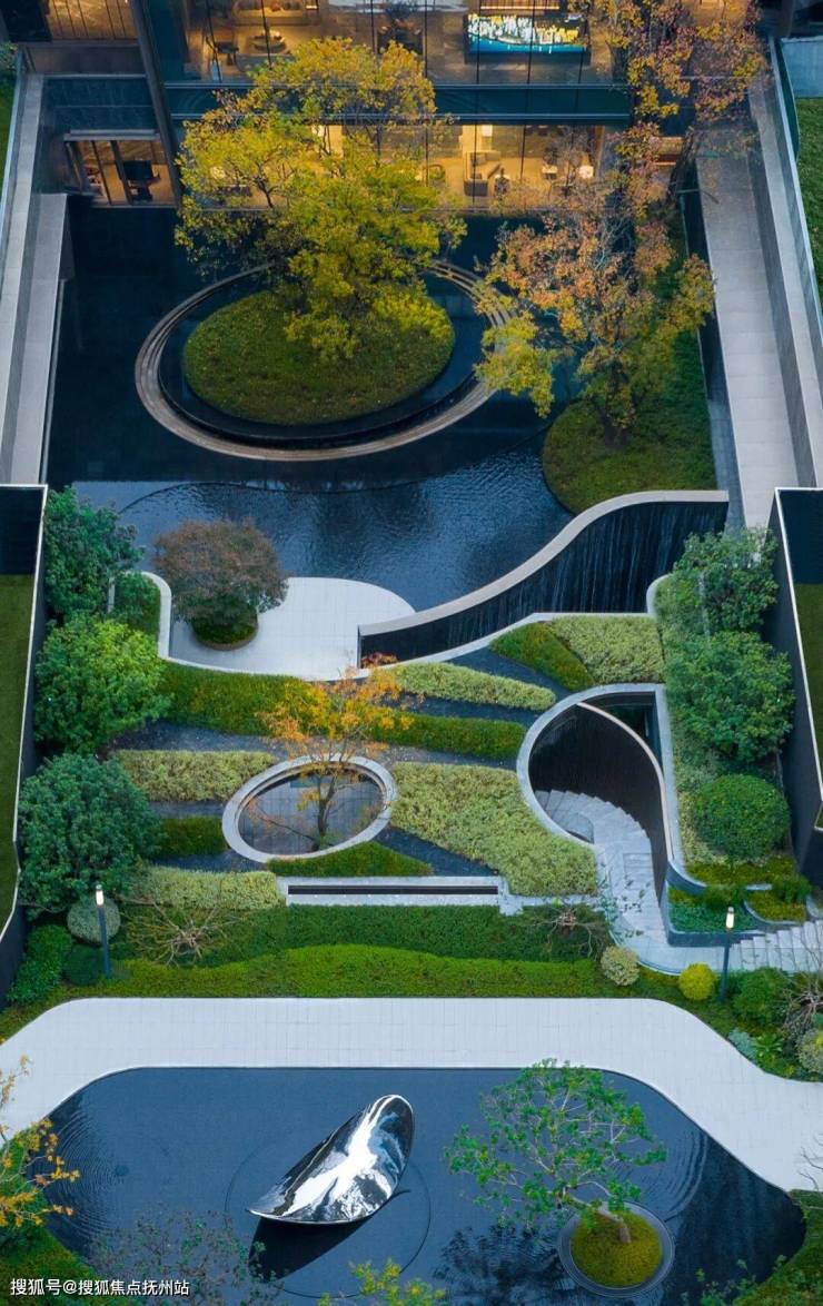 流动江屿,艺术奢居,中央景观分为四大场景,多功能戏水池、林氧会客厅、超感水轴、水上艺术厅,约86米安哥拉黑大理石整石切割的超感水轴,灵动蜿蜒,串联中央景观的复合场景。