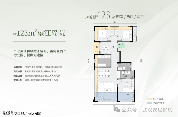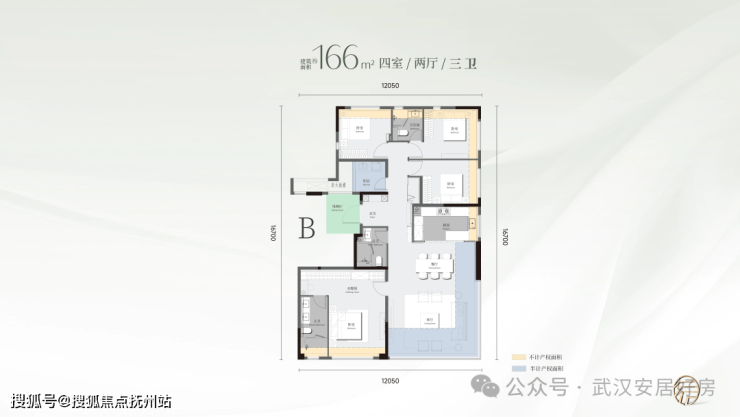 建面约166m²4房2厅2卫A户型(位于6#,7#楼的1户型),四开间朝南,不(计)产权面积”与“(半计)产权面积”区域较大,得房率较高。三卫设计较好的解决了多成员家庭早晚高峰的“卫生间拥堵”问题,大大提升了生活效率和私密性。格局较方正,空间利用率较高,配备独立生活阳台,解决了日常晾晒等生活需求。次卧带卫生间的设计,考虑了适老化居住的人性化需求。