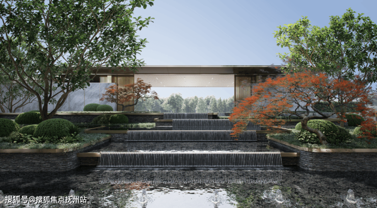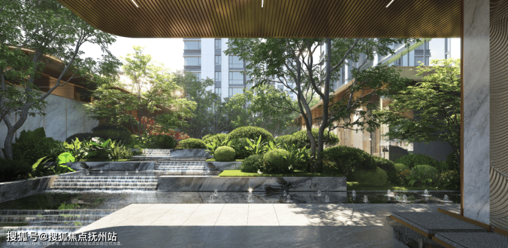 创新营造“中央景观体验轴”。以“汀水度假岛屿”为核心,设计水园相接的景观轴线,依次串联主入口、中心水景、阳光草坪、幸福剧场等核心节点,形成尊崇感与仪式感兼具的、情景交融式归家庭院体验。