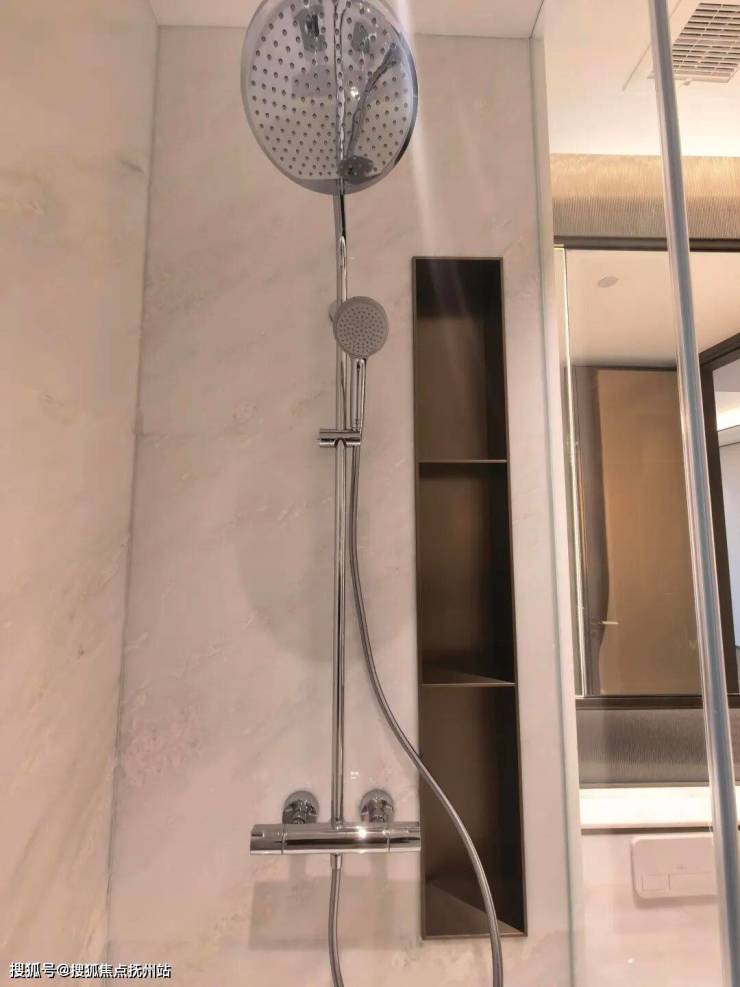再看主卫配置,主要石材目测是雪花白,浴缸是英国VA,和海潮望月同品牌,台盆唯宝,龙头金色雅生AXOR,汉斯格雅金色花洒,马桶唯宝智能马桶,土豪范儿拉满,整体配置略低于海潮望月,优于T-ONE潮博。