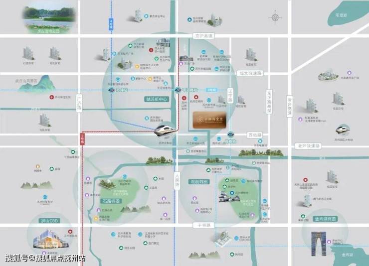 立体交通:轨交2/4/6号线、北环快速路、苏州火车站、京沪高速、常台高速等