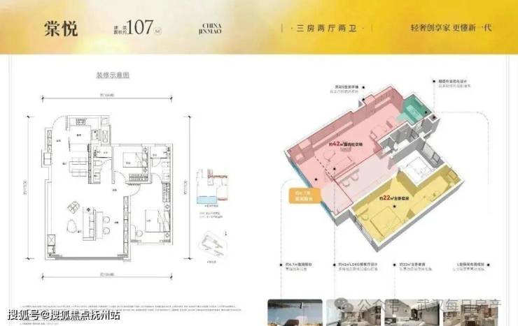 棠悦(建面约107㎡,3房2厅2卫):高层入门级产品,户型方正;约6.7米南向阳台连通客厅和书房;约42㎡LDKG餐客厅一体化,社交场景多元化;内部承重墙少,改造空间大,客厅和南向书房可随意组合。