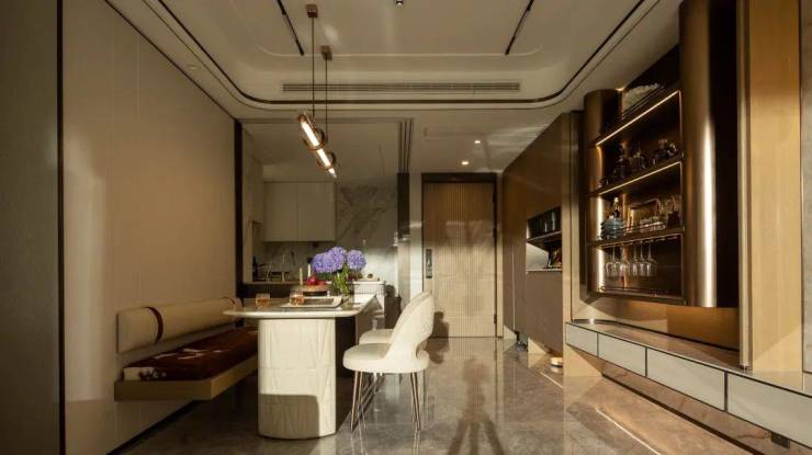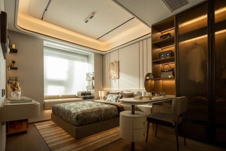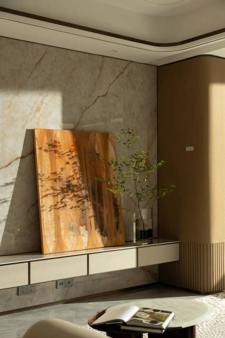 保利光合跃城营销中心:400-116-2990☎样板房的整体用材和工艺也很有惊喜,样板房用到了不少的奢石及复杂工艺。比如说,圆弧形吊顶让空间更具柔和美感,金属线条提升空间的层次感,细节之处精致考究。