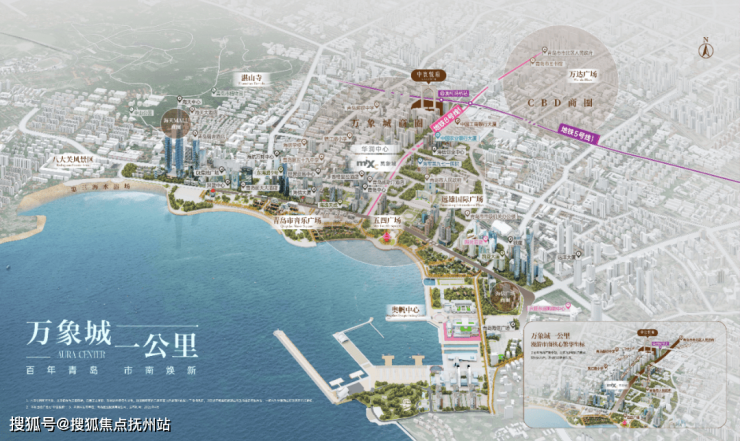 首先,中寰是青岛人都认可的城市中心。中央商务区在北,簇拥起青岛国际航运中心为地标的摩天森林;万象城在南,坐落在五四广场滨海地标与香港中路的交汇点上,为青岛的城市封面。
