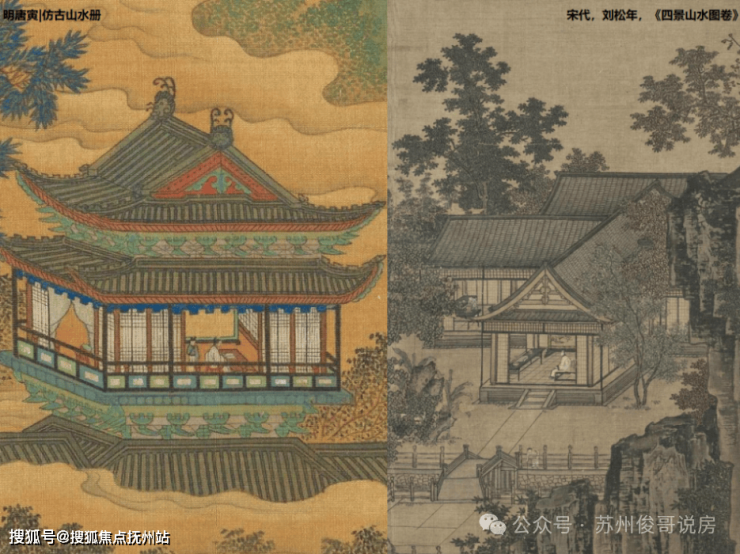 萃取唐伯虎《仿古山水册》三段式构图,融合苏式屏风山墙;