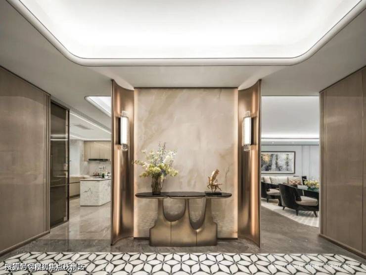 以玉兰门庭—迎归大堂—莳花荟为主轴,敬献步履生辉的归家艺旅:玉兰门庭如繁花盛绽,尊华瑞鳞水景聚运生财,双尊铜狮镇守家宅;迎归大堂流转光影艺韵,百羽栖澜艺术雕塑、芦海宸韵非遗绣作流淌摩登气韵;莳花荟中央会客厅移步异景,献映会客、休闲等雅会。