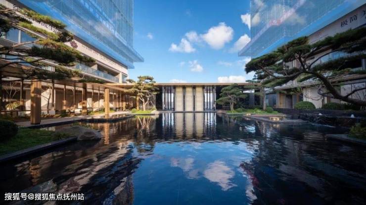 一方水院,倒映天光云影,银光绣带如瓯绣般在水中飘逸,与景石树影共绘一幅现代瓯越山水画。风雨连廊悄然引至生活美学馆,四面通透似悬浮玻璃盒子,将天光、水色、绿意尽揽其中,模糊自然与建筑的界限,诠释无边界的交融美学。在这里,风雨连廊不仅是归家的路径,更是一程从容相伴的诗意旅程。