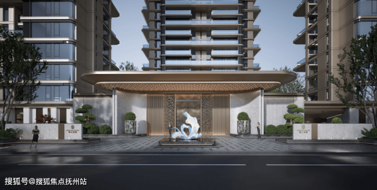 璀璨奢华之门,彰显尊贵与品质。以景墙与水景延展的华丽建筑界面进行装饰,营造酒店式艺术迎宾氛围。融合宁波依水而生的水浪元素以及市花“茶花”元素,打造专属宁波的主题仪式景观。提取传统建筑窗花元素作为地面图案,并增设奢石花钵,塑造专属门楼记忆。借助街区退让设计,实现从城市界面的自然过渡,进而进入具有都市感的商业配套街区。从富有都市感的远景引入匠心手作的震撼体验,层层递进、张弛有度,体现了现代艺术追求与城市烟火气息的融合。