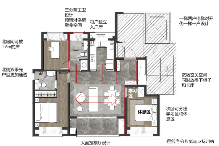 建面约90㎡的3室2厅2卫,一梯两户的设计,有着不低的得房率。