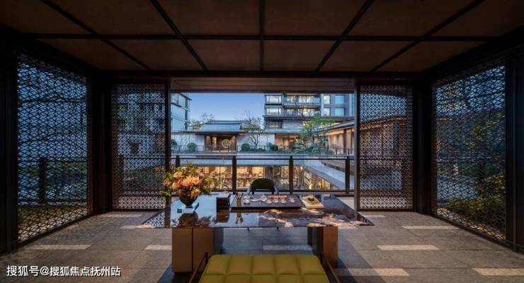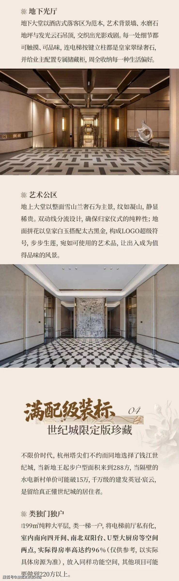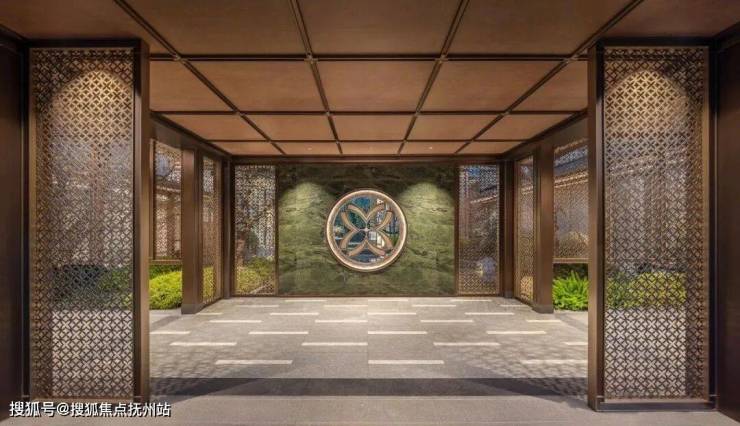 采用“王府中式”设计,大门为歇山顶形制(宽53米、高近11米),配黄铜狮、罗汉松及蓝翡翠奢石。园林融入西湖十景元素,如“花港观鱼”水景、“柳浪闻莺”绿植,并设雾森系统首层单元门厅石材铺就,肌理沉稳。
