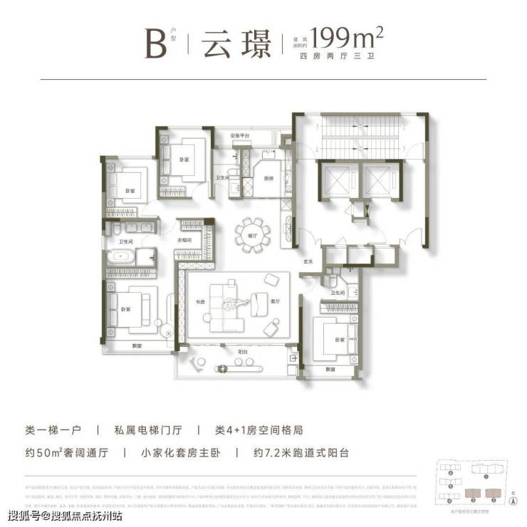 高层均为建面约199㎡的大平层户型,极致纯粹的业主圈层,带来更为尊贵的居住体验。其户型设计尽可能扩宽南向开间的同时,展现出了极为阔绰的空间尺度,足以满足多代同堂的居住需求,成为众多购房家庭终极改善的首选。