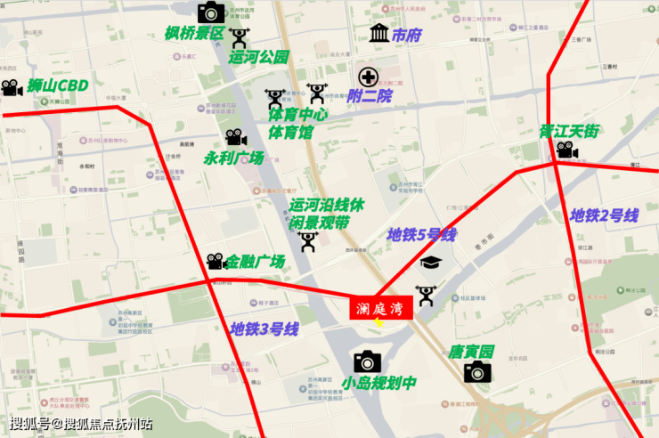 澜庭湾,充分享受到了姑苏区和新区,双向配套加持。如通过地铁5号线和3号线,把两大天街的配套得以串联。通过运河景观轴,可享受到姑苏区密集的运动配套。