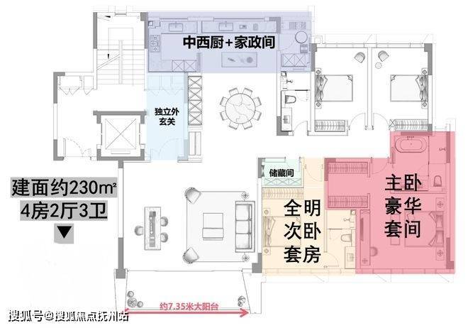 公区尺度非常大,南北开敞阳台、约7.35米大横厅、中西双厨、独立餐厅…而且南北通透。