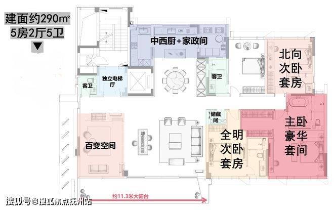 约290㎡户型,规划5房2厅5卫格局,得房率高达90%,空间利用率堪称极致。